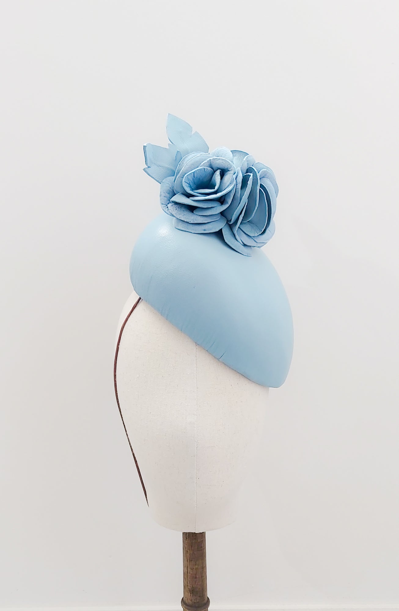 Baby blue nappa leather created in a percher style and embellished with hand crafted flowers. Perfect for the Mother of the Bride/Groom or if attending Race Days.
