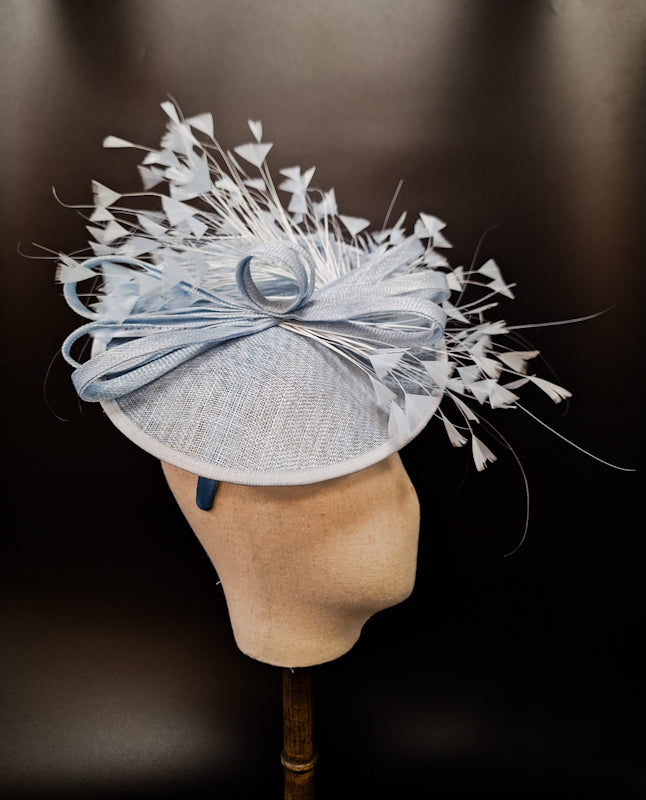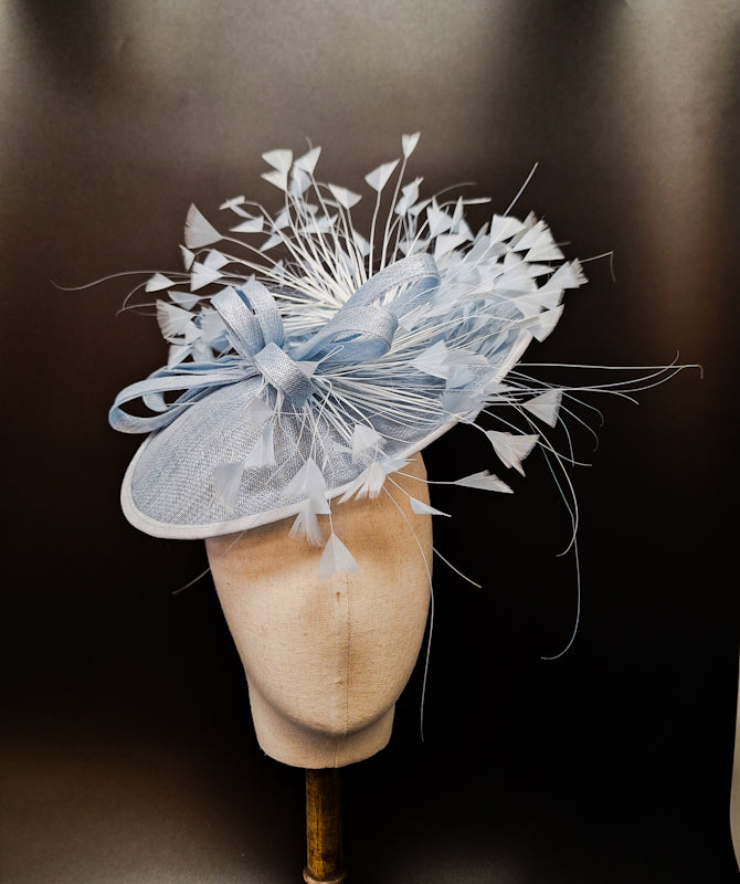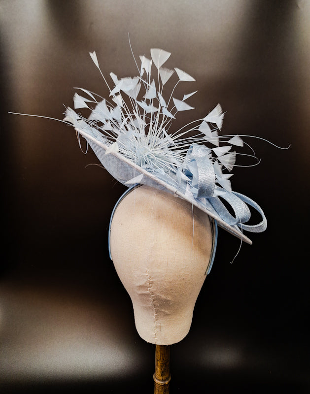 Elevate your look with this exquisite baby blue sinamay fascinator, designed to add a touch of elegance to any occasion. Featuring delicate sinamay swirls and soft, feathered accents in a complementary shade of blue, this headpiece exudes sophistication and charm. Perfectly perched on a blue-covered hairband, it sits gracefully to the right side of the wearer’s head, offering both comfort and a flawless fit. Whether you're attending a wedding, race day, or a formal event, this fascinator is the perfect finishing touch to make you stand out with style.
